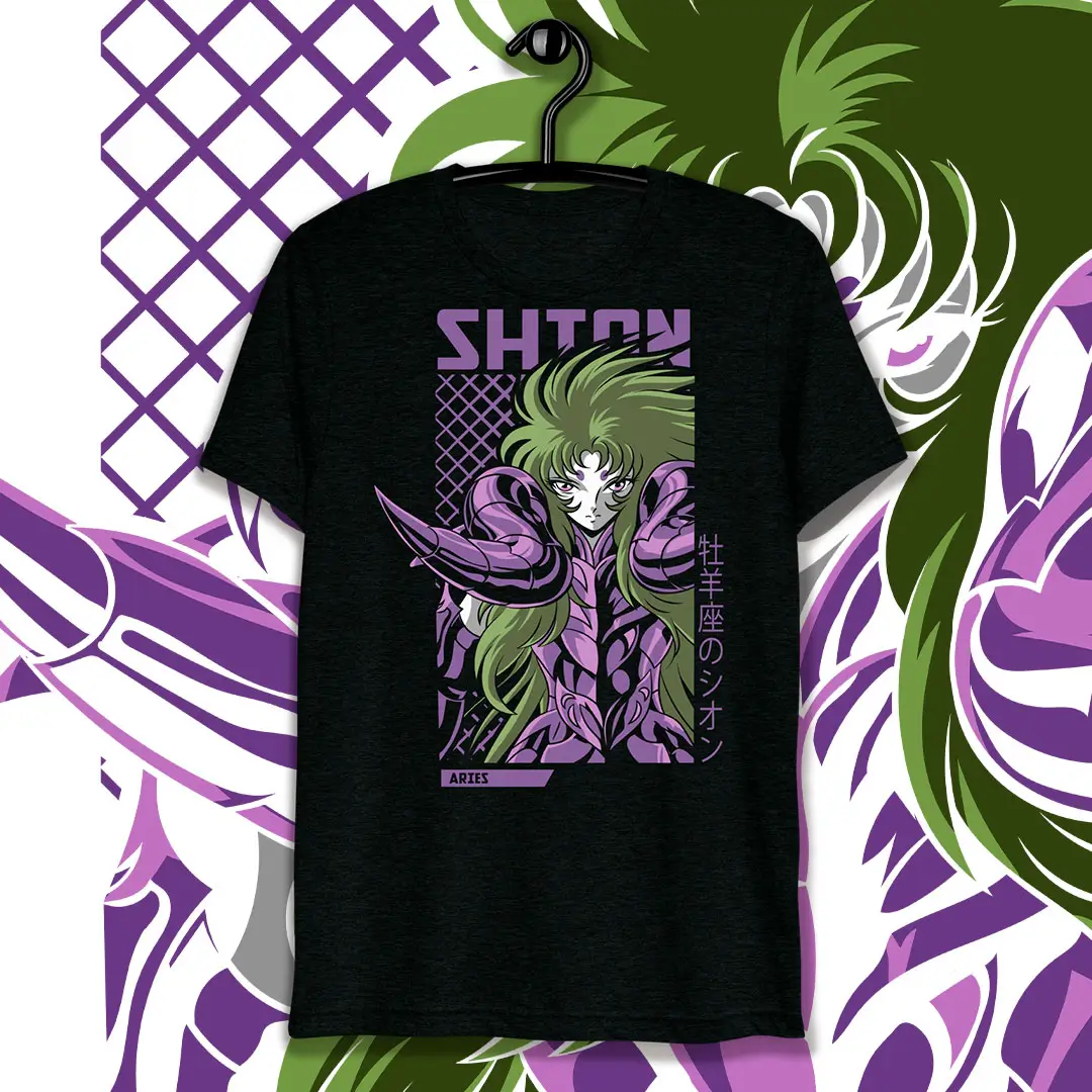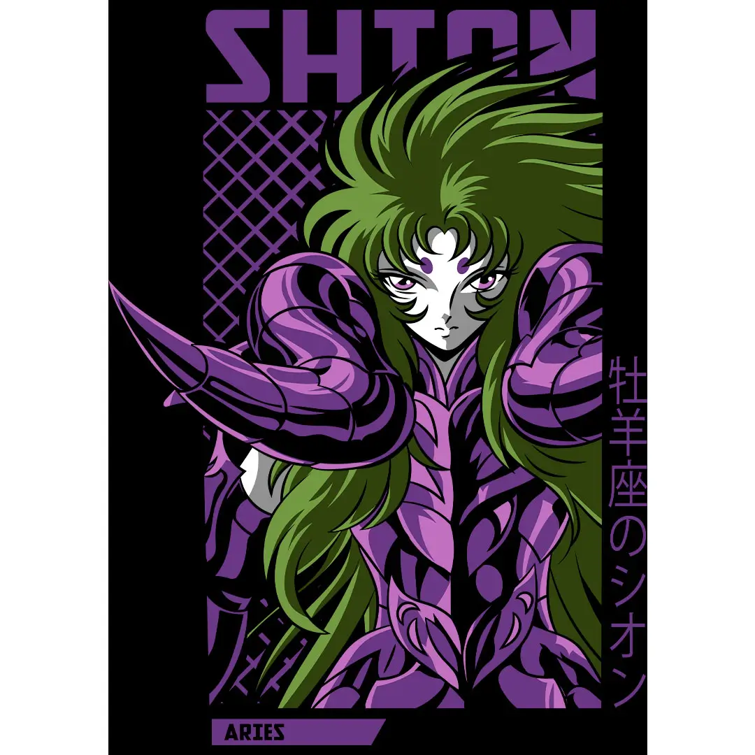 Este diseño no es solo una ilustración más; es una representación poderosa y detallada de Shion de Aries, un personaje icónico del universo de los Caballeros del Zodiaco. Los colores vibrantes y los detalles meticulosamente elaborados aseguran que cada pieza estampada con este diseño se destaque y atraiga todas las miradas.