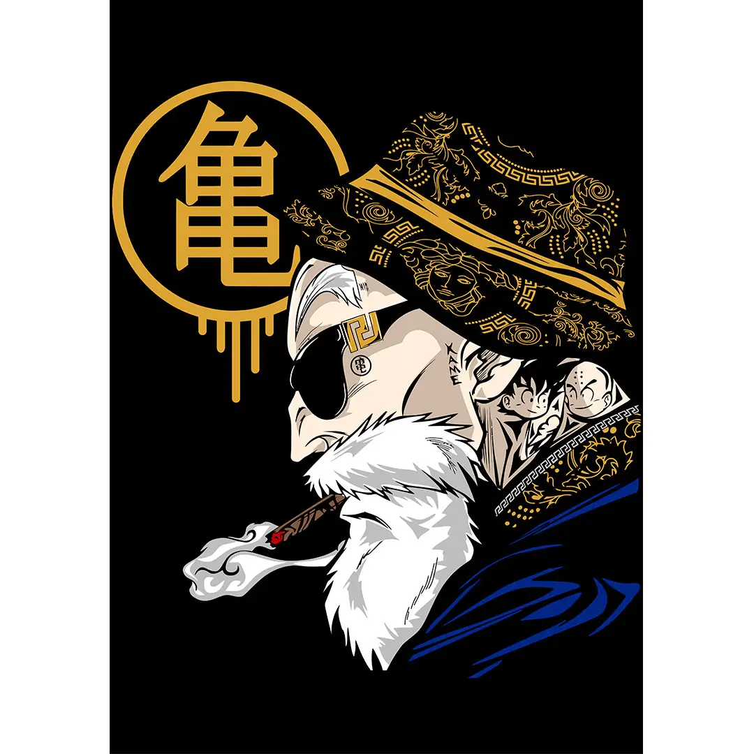 El diseño muestra a Roshi en una versión streetwear, con detalles dorados, tatuajes, gafas oscuras, y el clásico símbolo “Kame”, más una ilustración integrada de Goku y Krillin — un guiño nostálgico que los fans amarán. Perfecto para marcas de ropa urbana, tiendas de personalización o proyectos de merchandising geek.