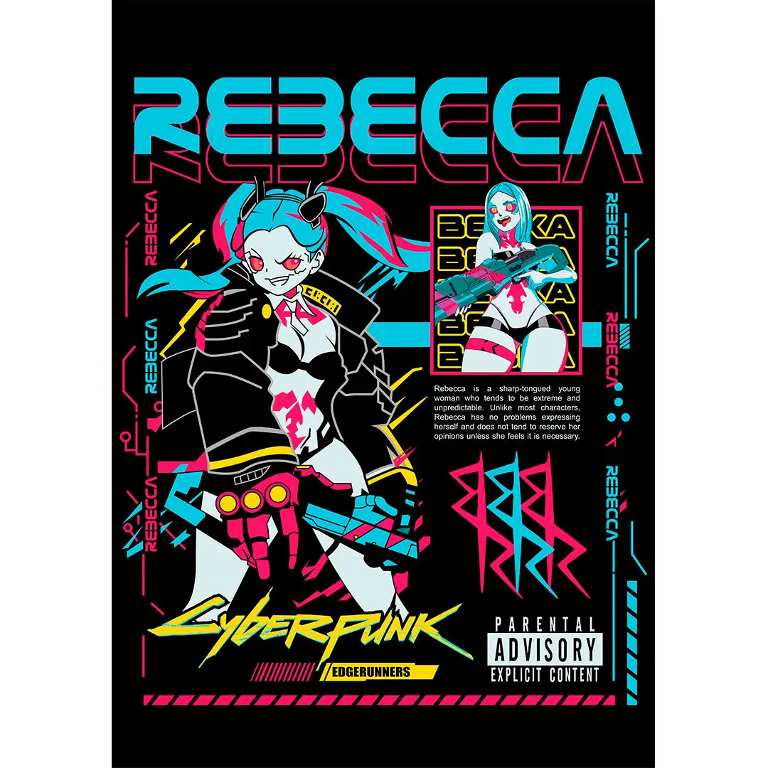 Rebecca es un personaje icónico por su estilo irreverente, colores vibrantes y actitud desafiante, lo que lo convierte en un diseño altamente atractivo para el público objetivo de productos alternativos y de tendencia.